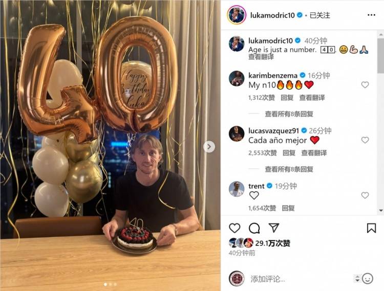 2. 莫德里奇庆祝40岁生日,幽默调侃年龄